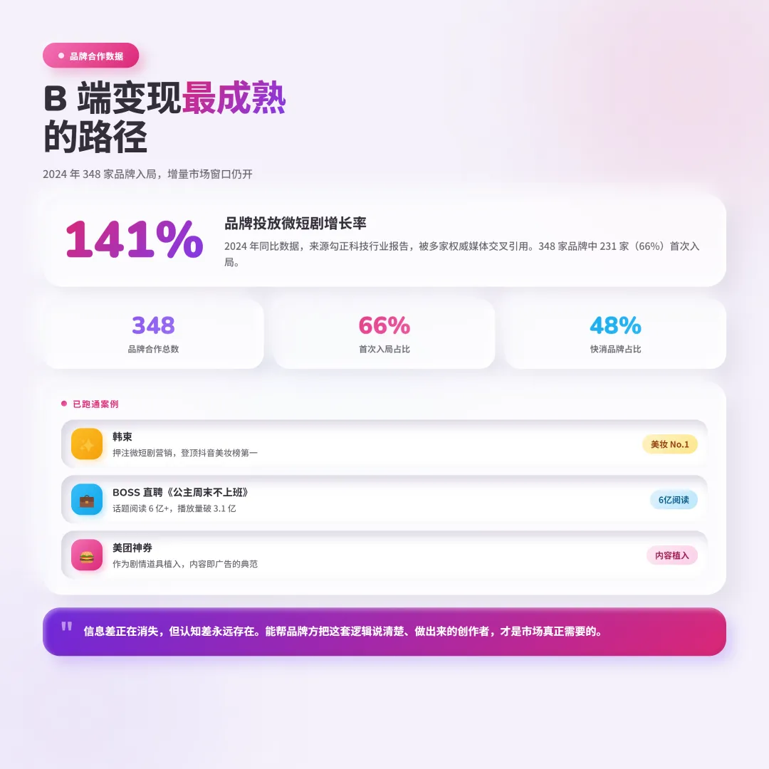 数据先说话:2024 年有 348 家品牌与微短剧合作,品牌投放微短剧数量同比增长 141%——这组数据来自勾正科技行业报告,被多家权威媒体交叉引用,可信度高。更关键的是,这 348 家里有 231 家(占比 66%)是首次尝试投放,说明这个市场仍处于增量阶段,入局不晚。