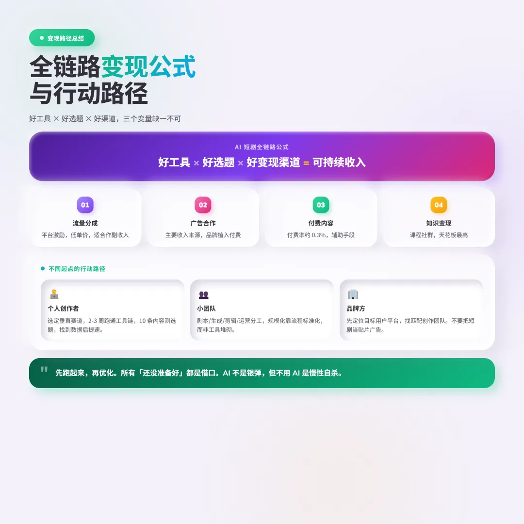 AI 短剧的全链路公式说清楚了:好工具 × 好选题 × 好变现渠道 = 可持续收入。三个变量缺一个,链路就会断。