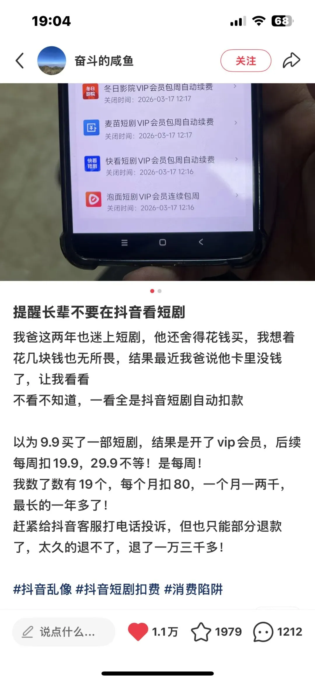 孩子们,刷到这条一定要转给爸妈!最近刷到一个真实案例,看得我头皮发麻:一位网友的父亲沉迷抖音短剧,以为花9.9买了一部剧,结果稀里糊涂开通了19个自动续费会员,每周扣19.9、29.9不等,一个月被扣一两千,最长的扣费已经持续了一年多!最后投诉只追回了一万三千多,太久的扣款根本退不回来!这不是个例!现在抖音上的短剧已经成了专门坑中老年人的“消费陷阱”,无数长辈的银行卡正在被悄悄“吸血”,今天就把这些套路拆得明明白白,赶紧给家里人提个醒!一、短剧扣费的“杀猪盘”套路,专坑中老年人