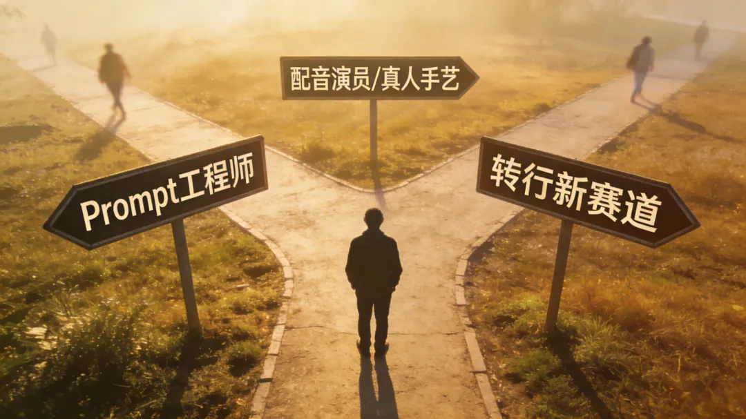 转行做Prompt工程师,专门教AI怎么演戏——从"被指挥的"变成"指挥AI的";去做配音,AI配音这块还差点人味,真人配音反而稀缺了;或者直接离开,用脚投票,接受现实。