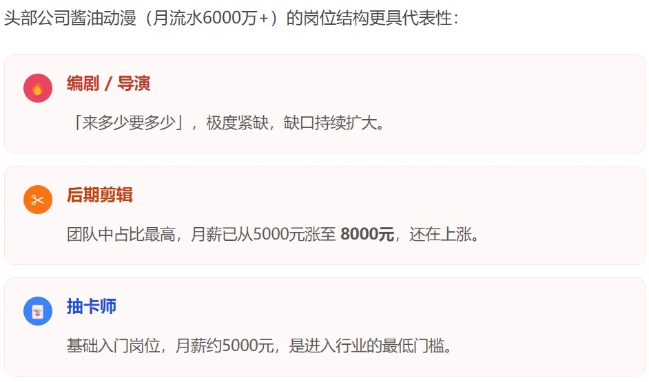 同一时间,酱油动漫创始人透露:公司编剧、导演岗位“来多少要多少”,剪辑师月薪已从5000元涨至8000元,二三线城市导演半年内从1万翻倍到2万,一线爆款导演月薪可达4万。