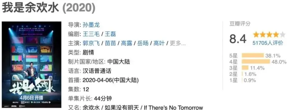 口碑方面,豆瓣评分短期吸引到5万人评分,从开局8.4上升至8.5,虽近期回落至8.4,但4星以上观众占比超过86.5%,“逆生长”评分在国产剧已是久违奇景。《余欢水》也是2020年开年评分最高国产剧。