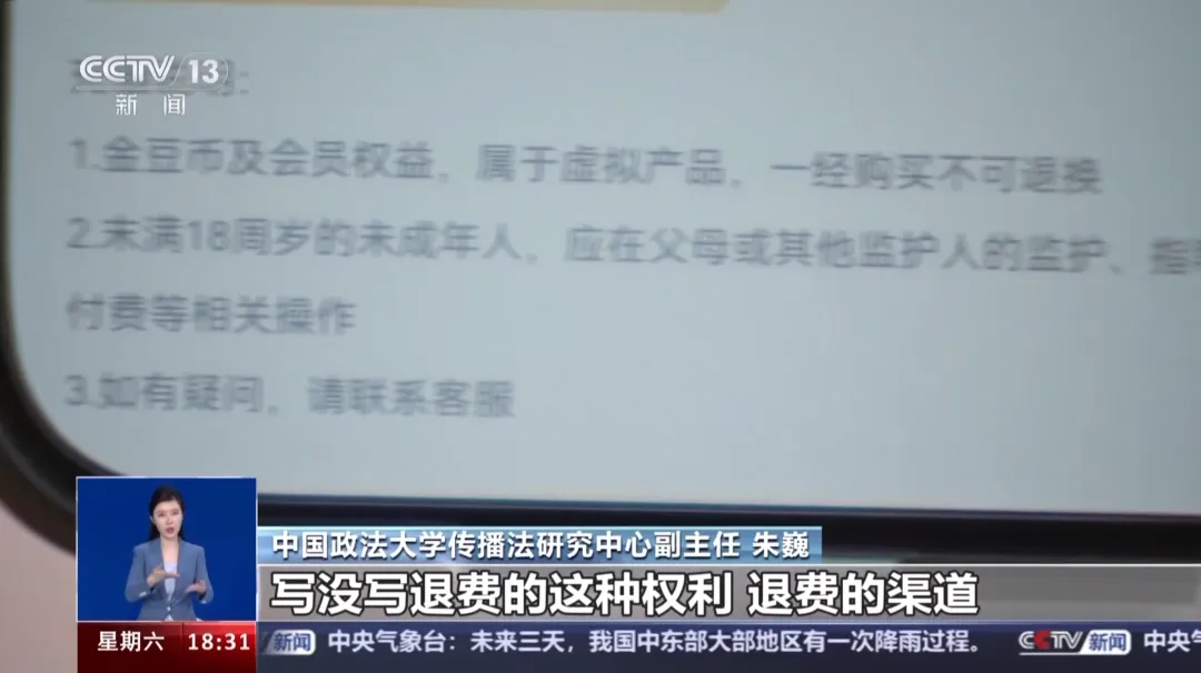 中国政法大学传播法研究中心副主任 朱巍:第一是要看微短剧的平台和微短剧的制作方有没有相关的许可,有没有备案;第二,在交钱的过程中,尽量不要一下交很多的钱,如果非得交的话,你要看他给的书面合同写没写退费的这种权利,退费的渠道,退费要把这个钱返回来多少的比例;第三,一旦剧集中间突然不播了,很可能是因为它播出的内容违法违规了,这个时候消费者可以主张退还所有的缴纳的费用。此外,专家还特别提醒消费者,微短剧的预付费机制并不代表消费者充了值就一定要将剧集看完。如果在观看过程中发现剧集有明显虎头蛇尾,或剧情拖沓、滥竽充数的行为,根据相关法律也可以申请退费。值班编辑 古丽 李加减
