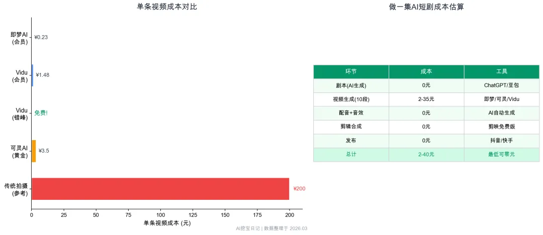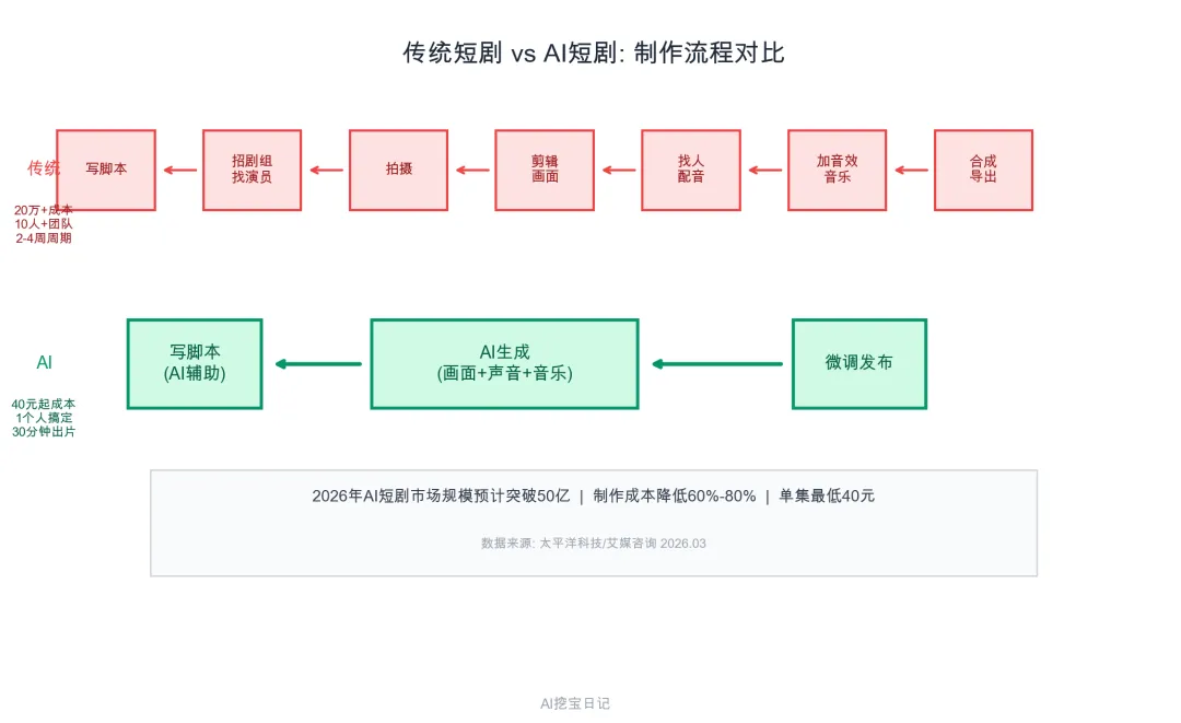 2026年AI短剧市场规模预计突破50亿, 比传统短剧制作成本低60%到80%. 传统短剧二十万起, AI短剧两万以内搞定, 甚至几百块就能出一集.