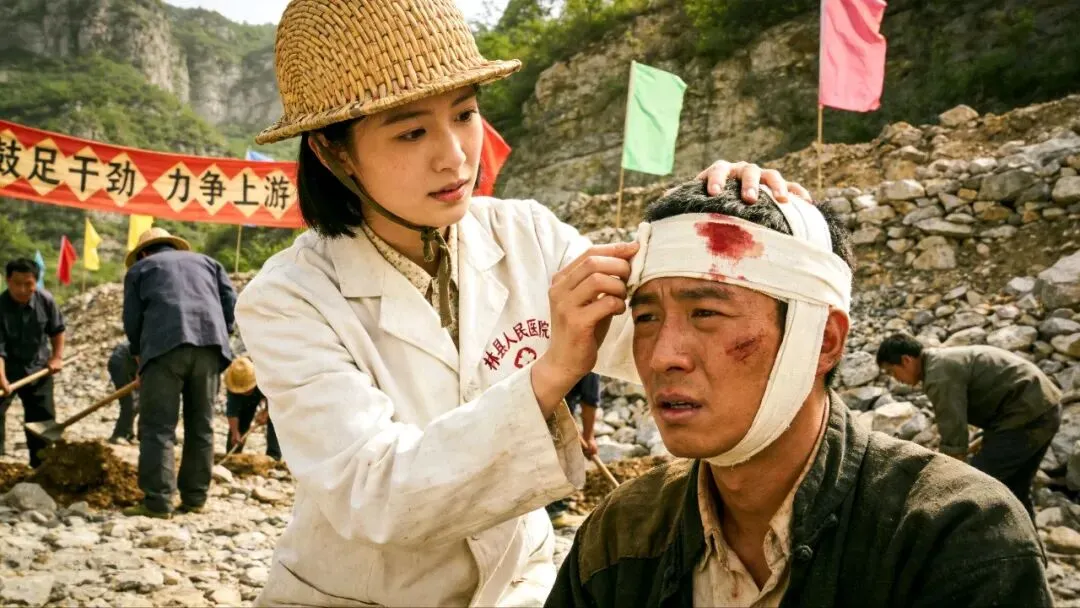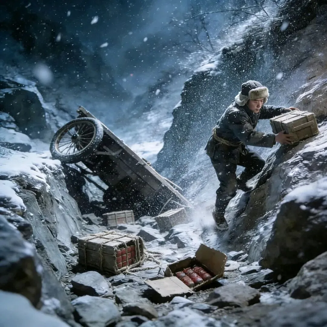 搞到轮胎,他又赶赴洛阳货场提五百吨炸药,却被限令“今天运不走就退回”。更狠的是,一伙穿中山装的人当面撕碎批文抢货。千钧一发之际,一辆黑色轿车疾驰而来,车窗里露出的一张脸,硬生生吓退了抢匪。暴风雪夜,运输队在太行山道遇险。平板车断轴,炸药箱滑落深渊。岳有水腰系安全绳跳下悬崖,一箱箱找回。发现头顶巨石松动时,他拼命摇绳示警,上方却误以为发出信号继续猛拉。巨石砸中他的肩膀,他在悬崖上撞击翻滚,被拉上来时浑身是血,却咧嘴一笑:“炸药没少。”第五幕:饿殍与暗线