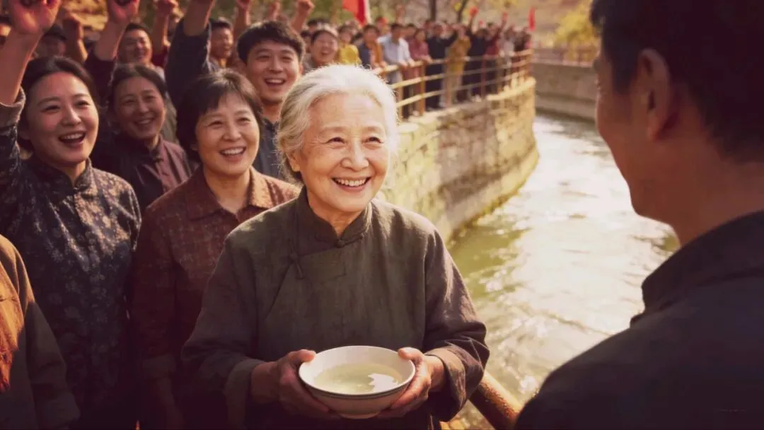 岁月流转,已是林县县长的李贵,带着宣传干事岳有水重访郝大嫂。家门口,一个青年正捧着水碗痛饮,岳有水如临大敌般怒夺水碗:“这是郝大嫂十几里外舀来的保命水,你凭什么喝?”