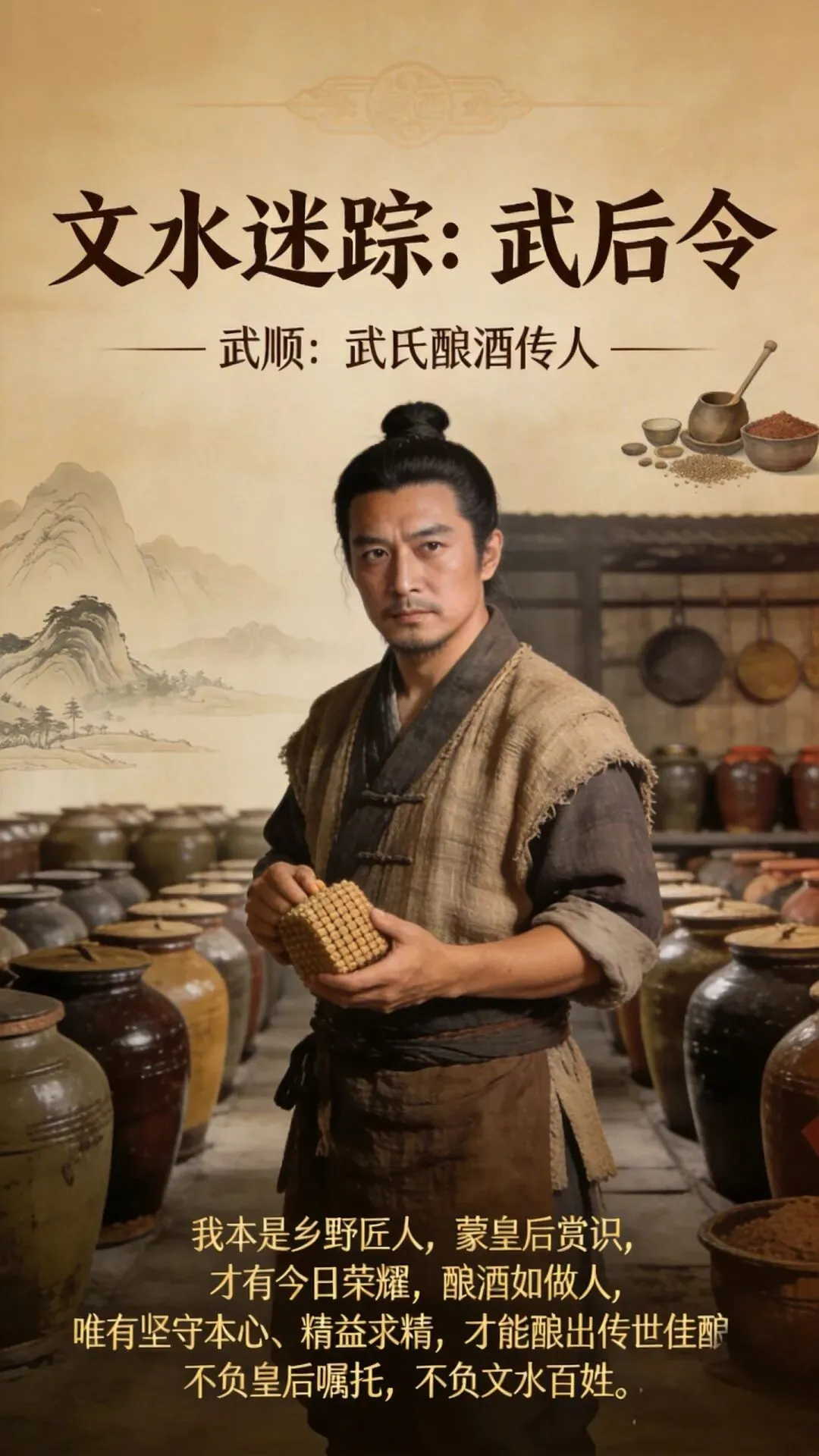 闪回:垂拱元年,武则天以太后之尊回文水省亲,銮驾行至桑落坊外,忽闻阵阵酒香,驻足询问,得知是当地酿酒师武顺(武氏族人)所酿,龙颜大悦,命人召武顺觐见。