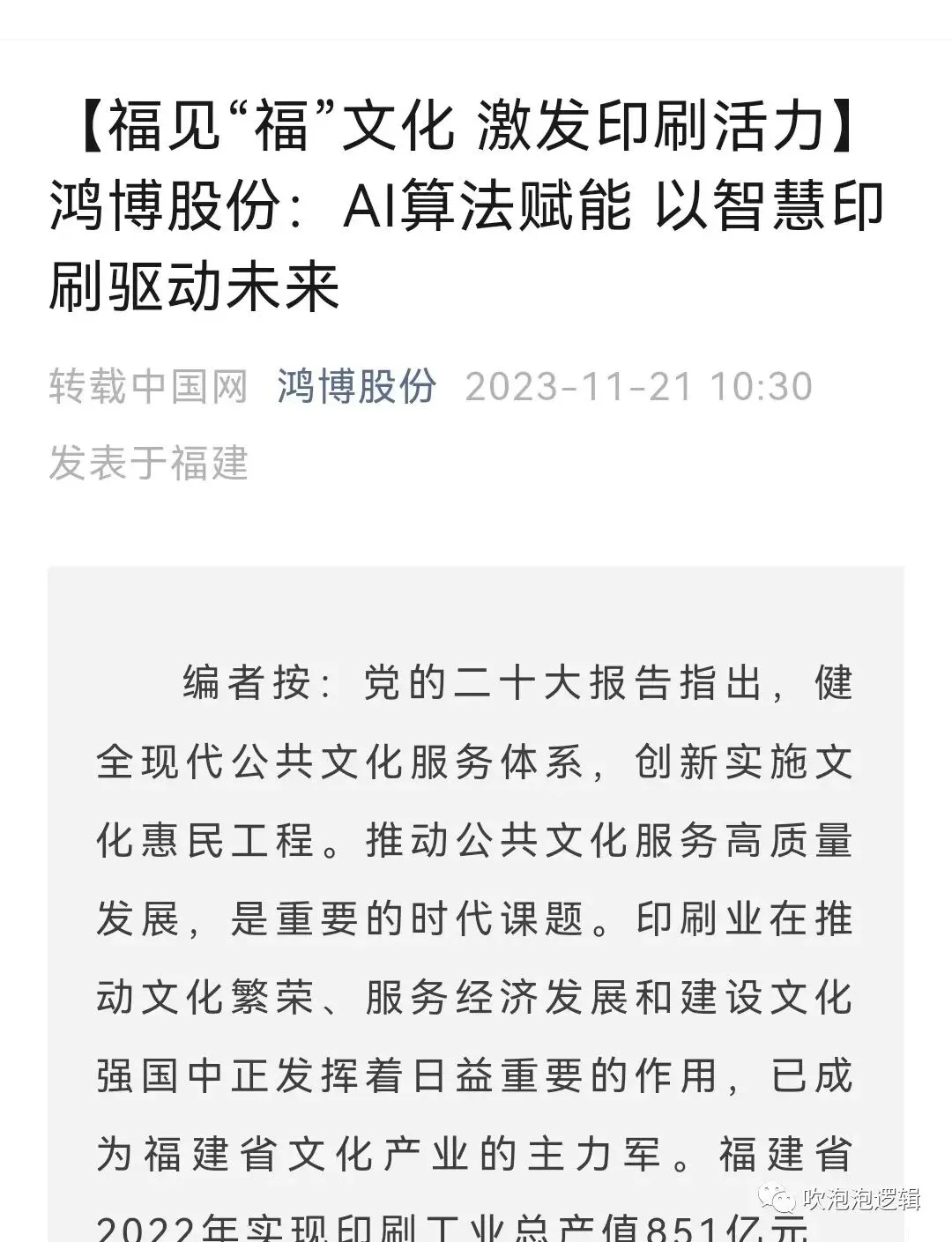 如果从这个角度思考,又能想到一些细节,以前的文章开玩笑提过鸿博的印刷业务可以搞印刷大模型,最近我看鸿博官方公号发了对印刷进行AI赋能了,我不说可能你们都不知道,因为很多业务在默默地开展。
