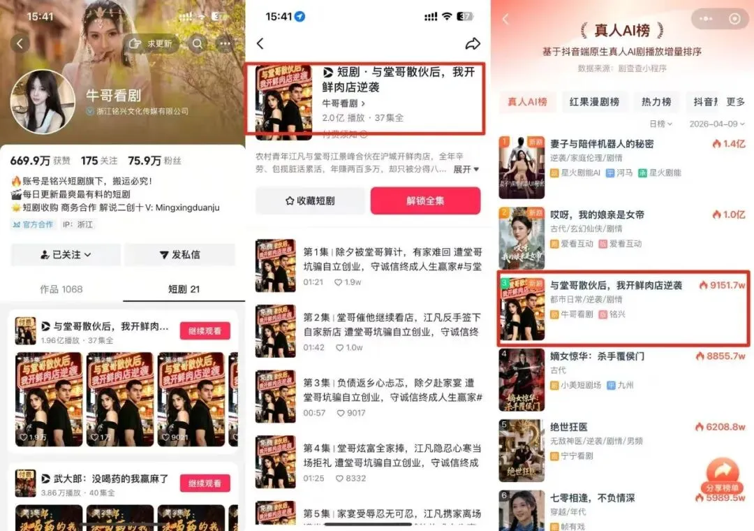 截至目前,《被堂哥坑后,我开鲜肉店暴富》在抖音牛哥看剧账号累计播放量超2亿,37集全量内容持续稳定输出,登顶抖音真人 AI 榜前列, 用实打实的播放数据,印证了铭兴文化传媒在短剧赛道的内容创作与宣发实力。