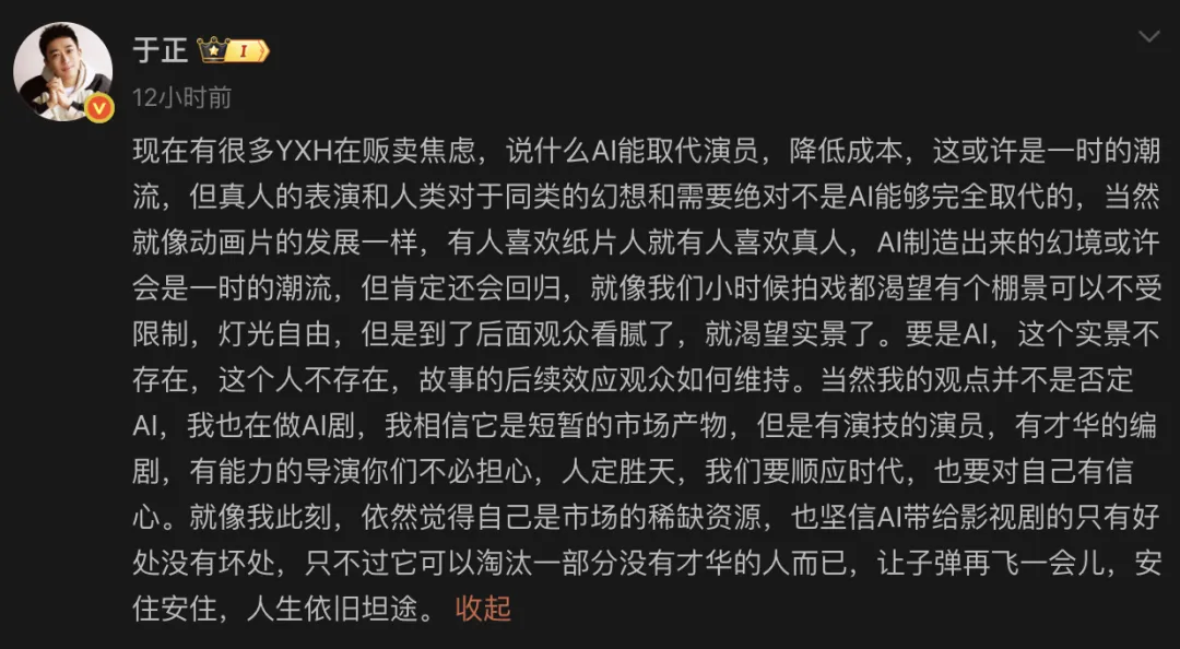 其实说到底,技术革新从来不是为了消灭某个行业,而是为了让行业变得更好。AI不是演员的敌人,也不是影视圈的“洪水猛兽”,只是一个帮大家省钱、提效的工具。未来的影视圈,应该是真人主演撑场面、带流量,AI配角补空缺、省成本,两者相辅相成,才能拍出更多好看又赚钱的作品。