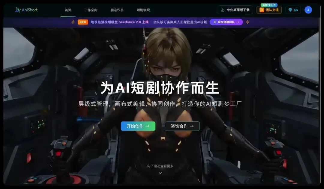 AniShort是国内领先的一站式AI真人短剧全流程协同创作平台。它的价值远超工具本身,它集成了多画布创意协作、顶配Seedance 2.0模型、以及企业级团队权限与积分管理系统。