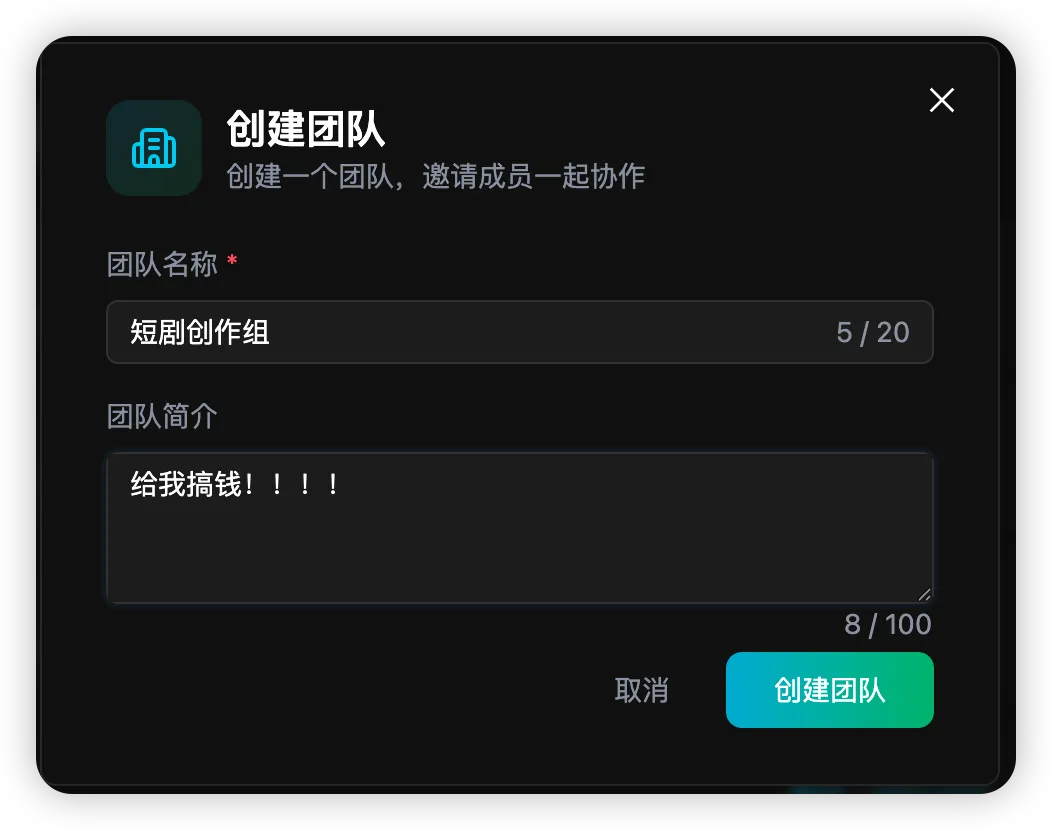 在AniShort创建团队,团队名称和简介自己取名,接着就是邀请你的编剧、导演、剪辑师加入。