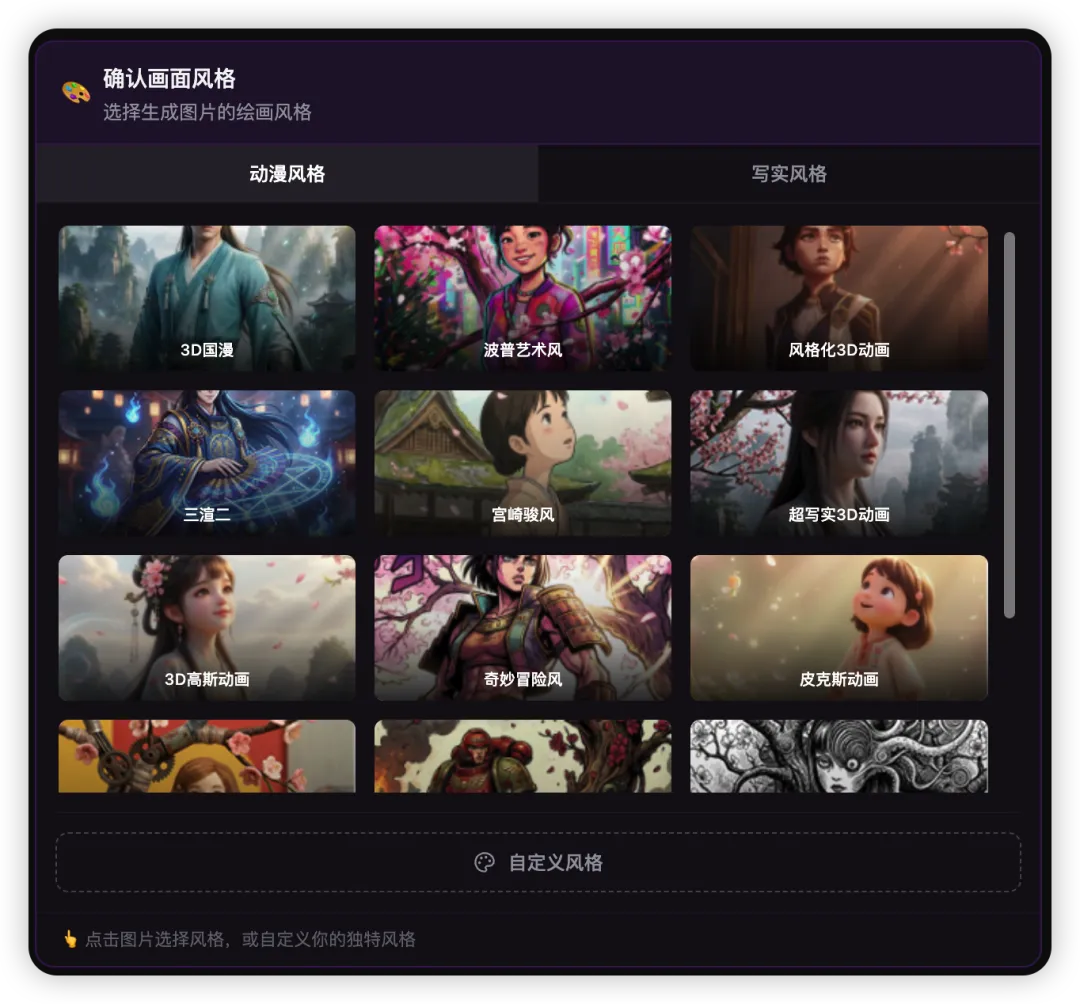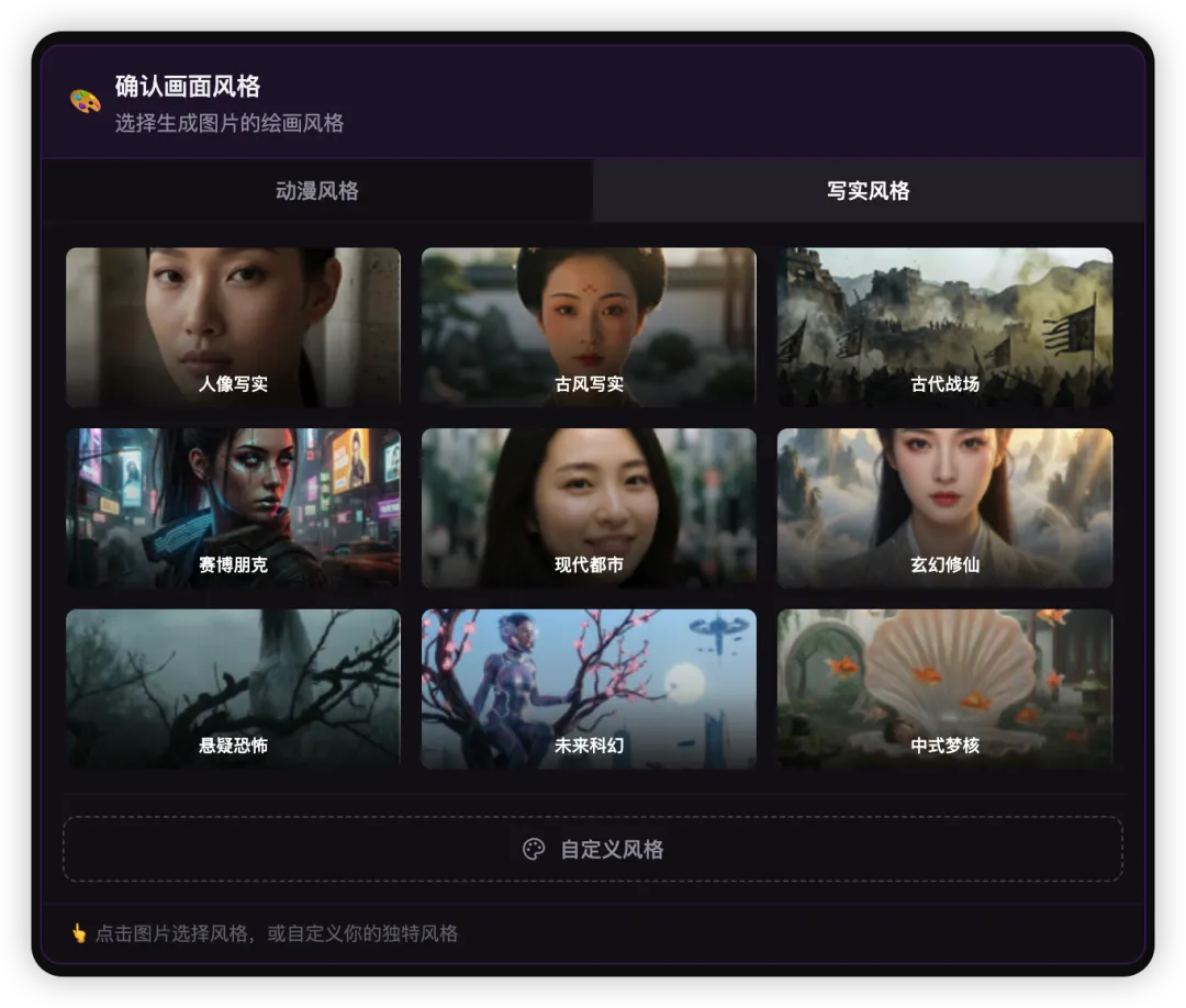 接下来是选择短剧的风格,目前短剧风格有不同,基本上分为动漫风格(非人脸)和写实的风格(仿真人)。刚开始选择超写实3d动画。