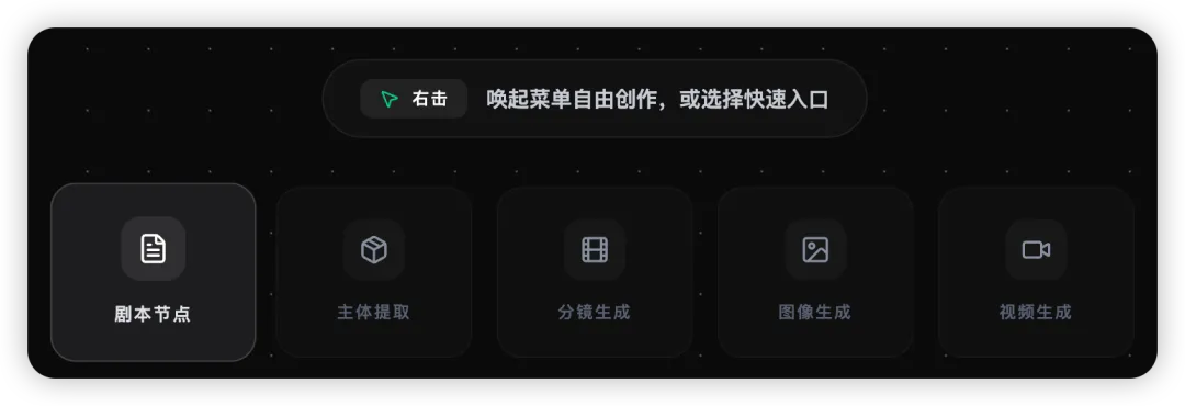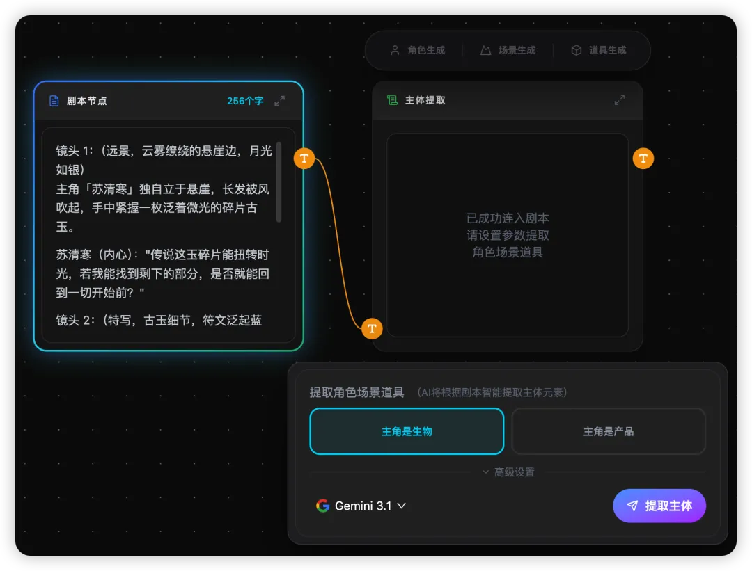 点击左侧画布里面「剧本节点」上面的「主体提取」按钮,会新增一个「主体提取」节点,选择让它提取角色、场景和道具。