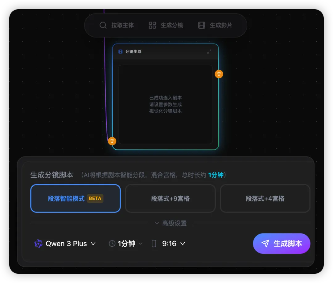 选中「剧本节点」,选择「分镜生成」按钮,就可以初次生成分镜了。