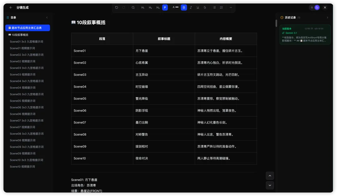 我选择了「Gemini模型」,9宫格,每段10秒,最终生成的分镜脚本如图,可以进行二次修改。