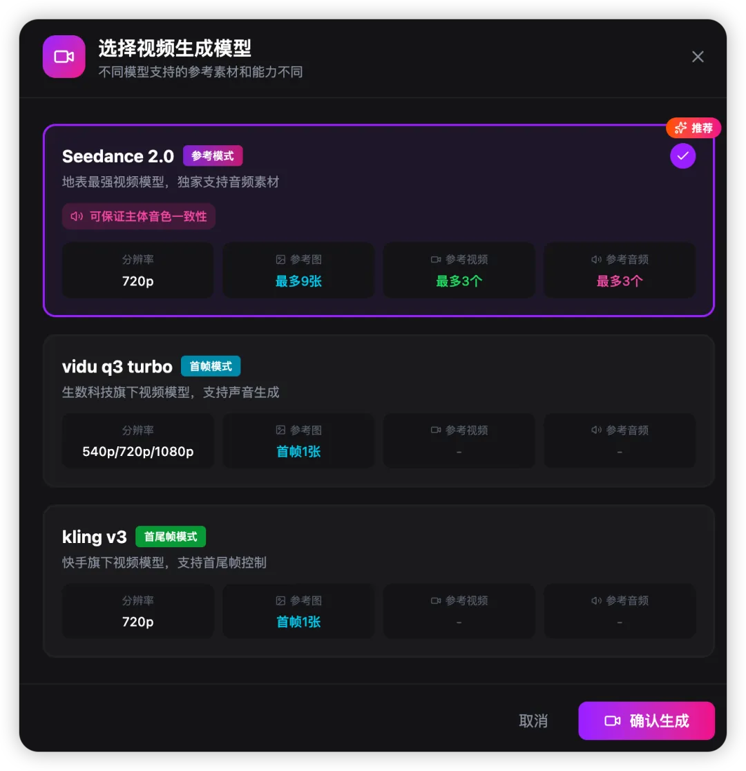 确认其他部分没有违规之后,就可以批量生产视频了。在分镜画布中,选择「分镜生成」节点的「生成影片」按钮,建议选择see dance2.0模型,效果更好,全能参考,为每个镜头连接「视频生成节点」。