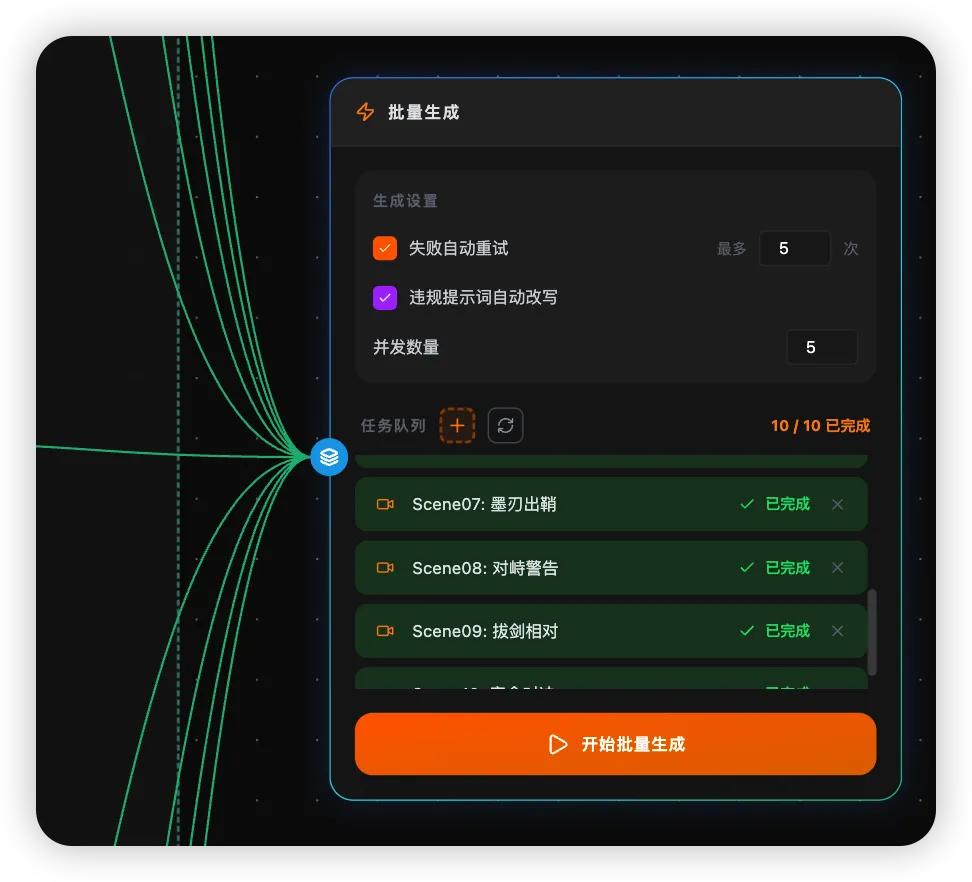 平台支持队列任务,可同时生成多个镜头,无需排队等待。