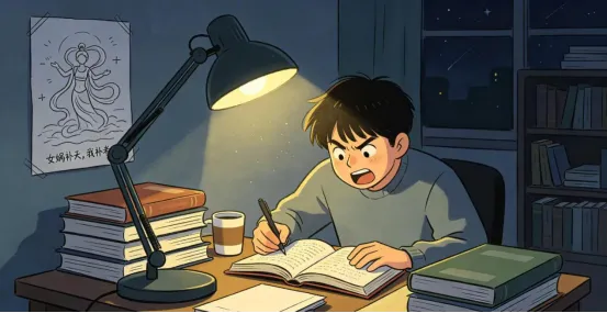 明天就要考试了,课本还是崭新的。你翻开目录,发现一共八章,你只听过前三章的前半节。你开始疯狂复习:一小时看完一章,笔记记了满满十页,但脑子里一片空白。凌晨一点,你终于“学完”了。躺在床上,你心里默念:女娲补天,我补考。第二天拿到卷子,第一题就不会。你看了看旁边的同学,他正在奋笔疾书。你深吸一口气,开始编,交卷的时候,你在卷子角落画了一个女娲,配文:“尽力了。”