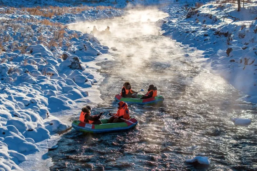 不冻河因地下温泉滋养,即便春日气温回升,依旧流水潺潺、雾气蒸腾,是阿尔山独有的春日奇观。穿上专业防寒装备,乘橡皮艇顺流而下,穿梭在半冰半水的河谷间,两岸雾凇未褪,新柳初抽,冰挂与新芽相映成趣。