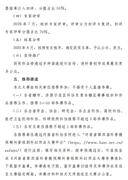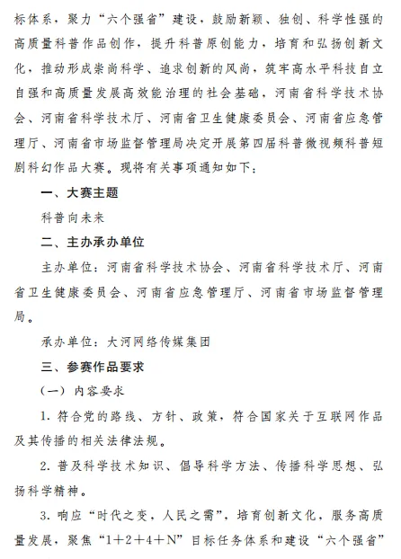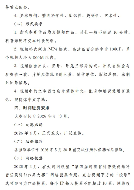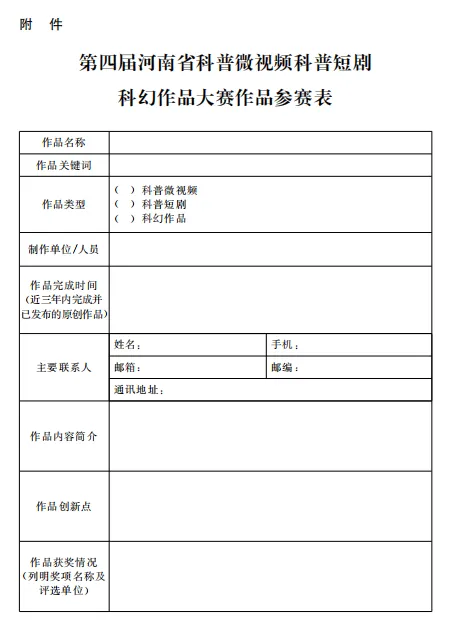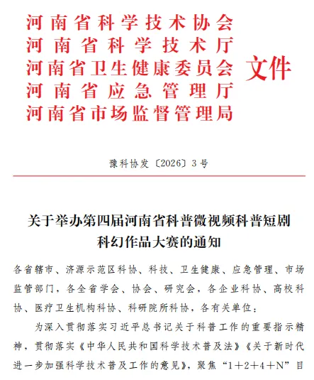 参加河南省第四届科普微视频科普短剧科幻作品大赛的作品,请于2026年5月11日前将参赛材料电子版(含参赛表签字盖章扫描件、参赛作品视频等)报送至县科协。