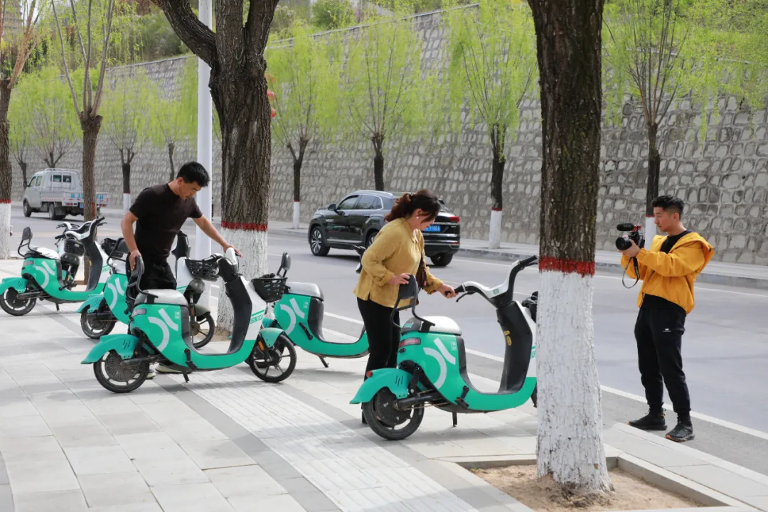 人间最美四月天。4月14日,春风拂柳,鄜州大地生机盎然。在富县开元路,塔柳相映成趣,一排排整齐的共享单车在阳光下格外醒目。这里没有车水马龙的喧嚣,却聚满了围观的市民——一场别开生面的文明小短剧拍摄正在这里进行。