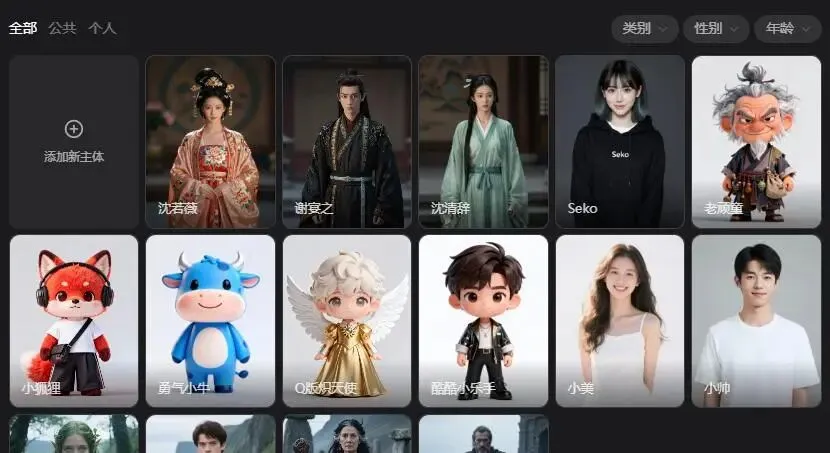打开SEKO,找到“添加主体”功能。点进去,选择“添加新主体”,把你提前用AI生图工具做好的角色照片上传进去。给这个角色取个名字,比如“男主”“女主”,然后点击“应用形象”。这个角色就保存在你的角色库里了。