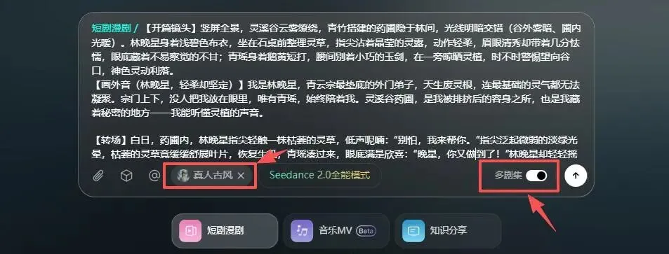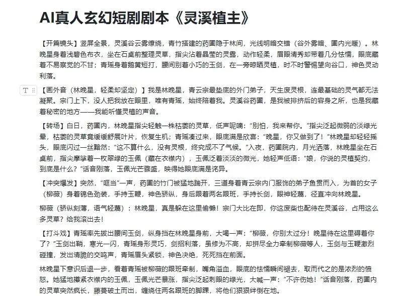 角色准备好了,接下来输入一段提示词。不需要写得多复杂,说清楚你要什么就行。比如我是用豆包写的一个剧本:“帮我写一个全新的AI真人短剧剧本,玄幻的,比较火的题材”