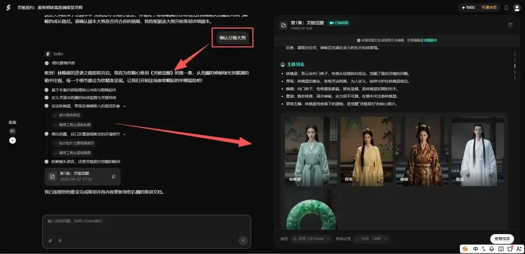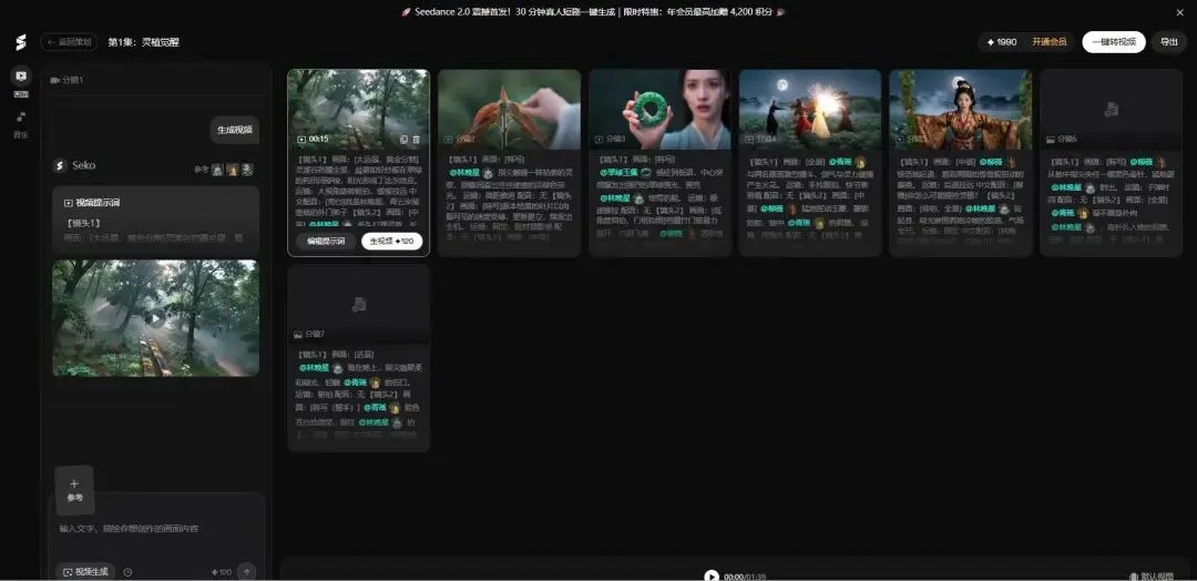 这里要提一下:SEKO生成的视频是带特效音、人物对话、对口型的。也就是说,它不是只有画面,而是直接给你一个十几秒的完整分镜片段——人物在说话,口型能对上,环境音也有。最后把所有分镜片段按顺序连起来,就是一集完整的短剧了。