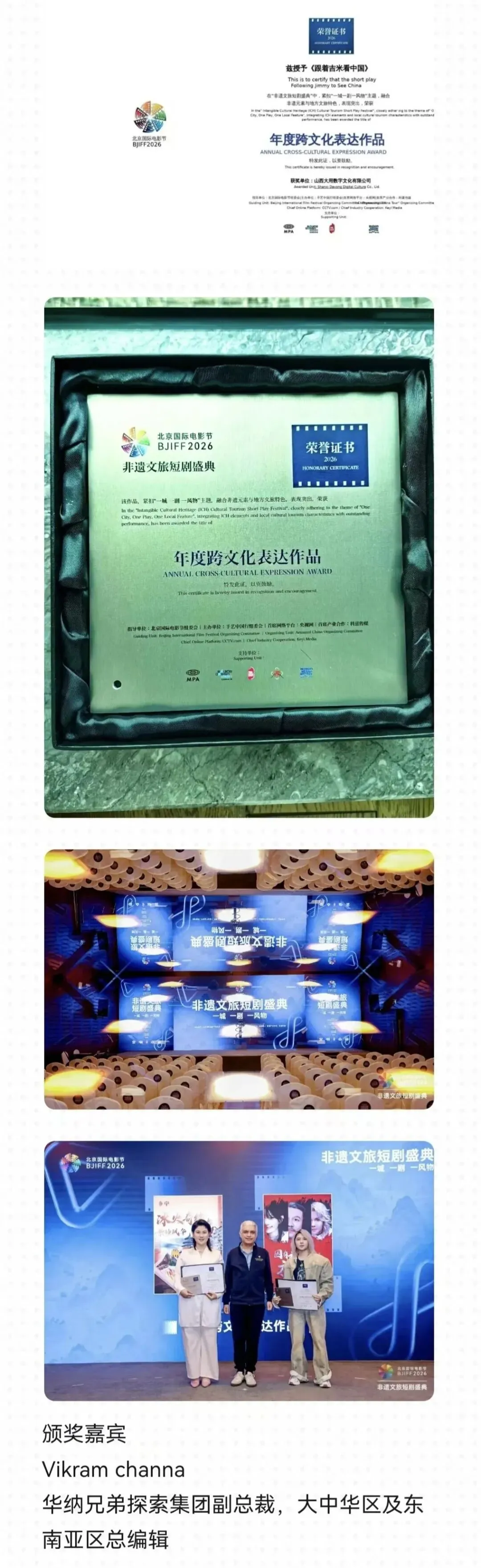 在近期举办的北京国际电影节中,由临汾精品微短剧基地山西大用数字文化有限公司出品的《跟着吉米看世界》(Following Jimmy to See China)荣获“年度跨文化表达作品”专业奖项。该作品紧扣”一城一剧一风物",将非遗文脉与地方风物融于光影,以外国之眼,观华夏万象之“古都·临汾”,让临汾非遗文化与文旅魅力惊艳世界。