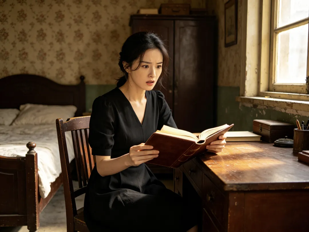 【风格】,【人物形象】,【核心动作 / 剧情】,周身环绕【氛围特效】,背景为【场景】,电影级画质,高清细节,情绪张力拉满,光影对比强烈,突出人物气场比如现代重生穿越爽文,女主身穿黑裙,翻看日记,惊奇发现原来自己就是原主,过去一切皆是梦境,背景在老房子的卧室里