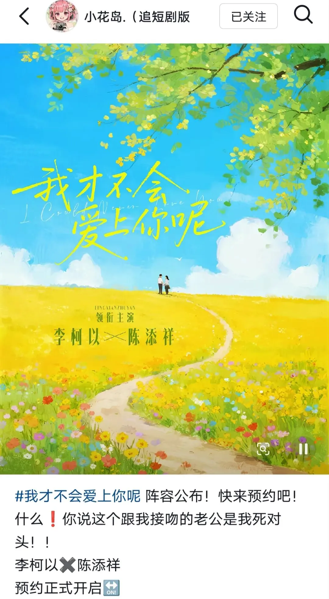 小花岛宣了,李柯以新剧《我才不会爱上你呢》的男主是陈添祥!