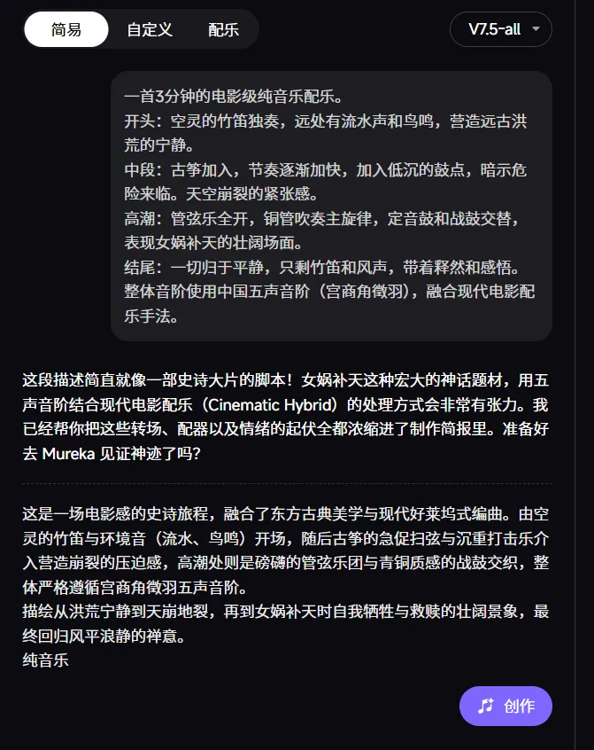 我是音乐小白,连简谱都看不太明白,但是不妨碍我用Mureka创作一首好听的歌曲。除了文章开头我创作的《穿越万古》主题曲之外。我还创作了一首融合东方古典美学与现代好莱坞式编曲,遵循宫商角徵羽五声音阶的背景音乐。