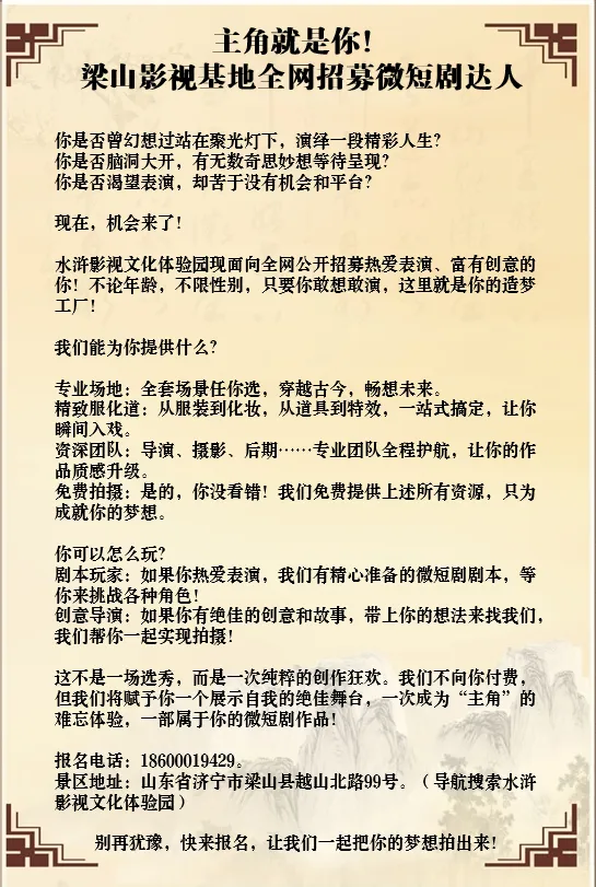 水浒影视文化体验园全网招募微短剧达人!不限年龄,不限性别,敢演你就来!