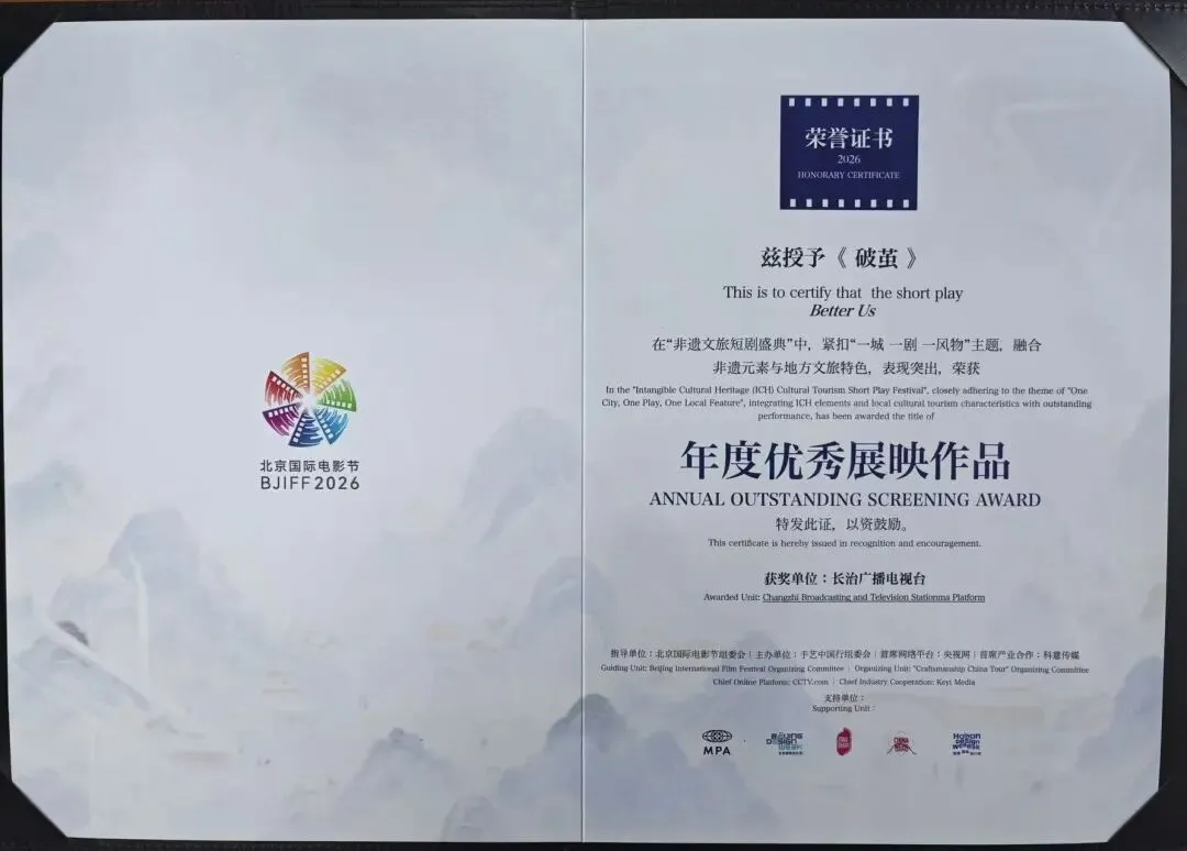 近日,第十六届北京国际电影节非遗文旅短剧盛典在北京坊·劝业场圆满落幕。由长治广播电视台出品的微短剧《破茧》,凭借本土非遗元素与长治文旅特色,成功斩获北京国际电影节“年度优秀展映作品奖”,长治广播电视台荣获“优秀组织奖”。
