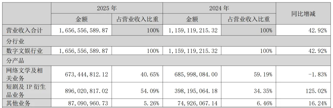 体来看,2025年短剧及IP衍生品业务实现营收8.96亿元,同比大增125.02%,占总营收的比例从2024年的34.35%跃升至54.09%。不过,该业务的营业成本也同步飙升了163.29%至5.52亿元,导致其毛利率同比下降8.95个百分点,降至38.41%。