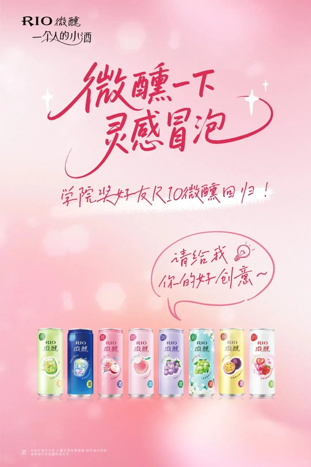 RIO微醺作品上传社交媒体平台(抖音/小红书/微博)必加话题 #RIO微醺一个人的小酒 #微醺校园图鉴,可选择同时艾特官号 @RIO锐澳鸡尾酒