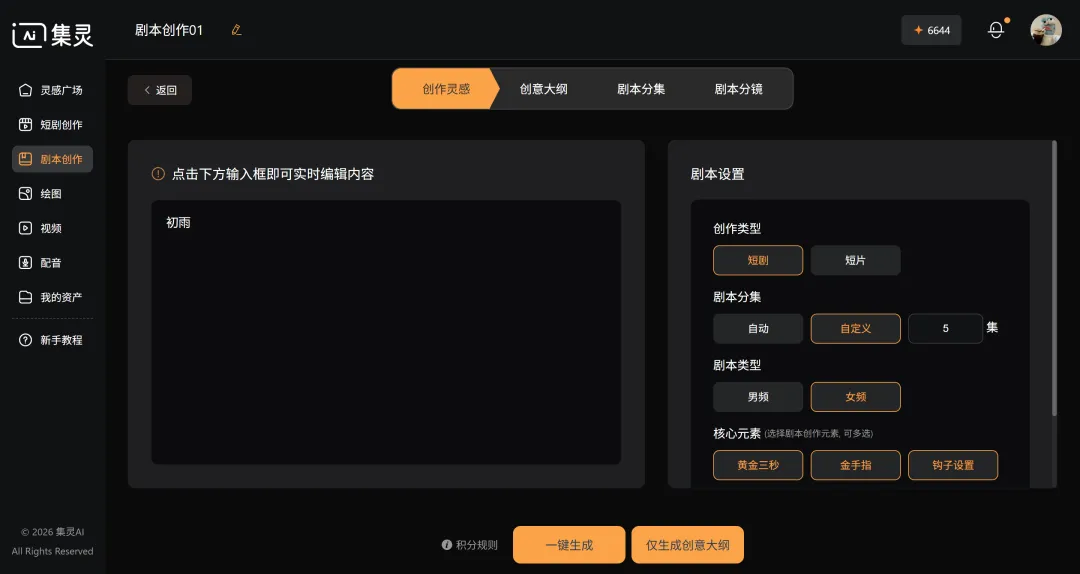输入一句剧情设定或核心主题,AI 自动生成包含台词、剧本发展方向、场景描述的完整剧本。同时,还能自定义设置剧本的分集、类型(男频/女频)、创作元素(黄金三秒/钩子设置/打脸节奏等)。