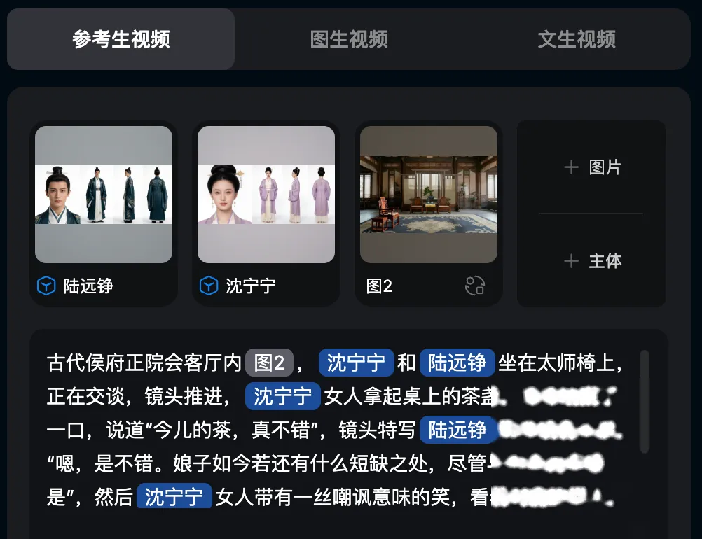 参考生视频不同。你已经上传了角色图和场景图,模型知道人长什么样。你只需要告诉它:这几秒钟里,发生了什么事。