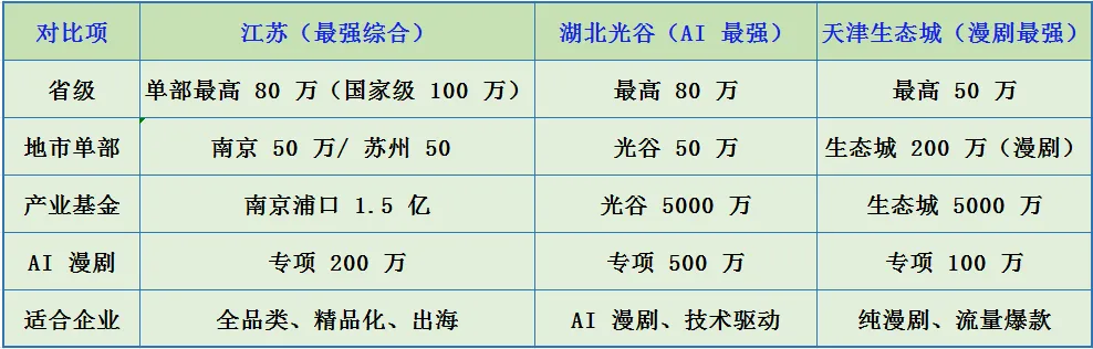 江苏是全国短剧 / 漫剧扶持第一梯队,采用「省级顶层设计 + 地市重金加码」模式:省级单部最高80 万、国家级获奖追加至100 万;南京浦口设1.5 亿产业基金、苏州单部最高50 万、AI 漫剧专项200 万,整体力度对标湖北光谷、天津生态城。一、省级政策(全省通用,2025–2027 三年)