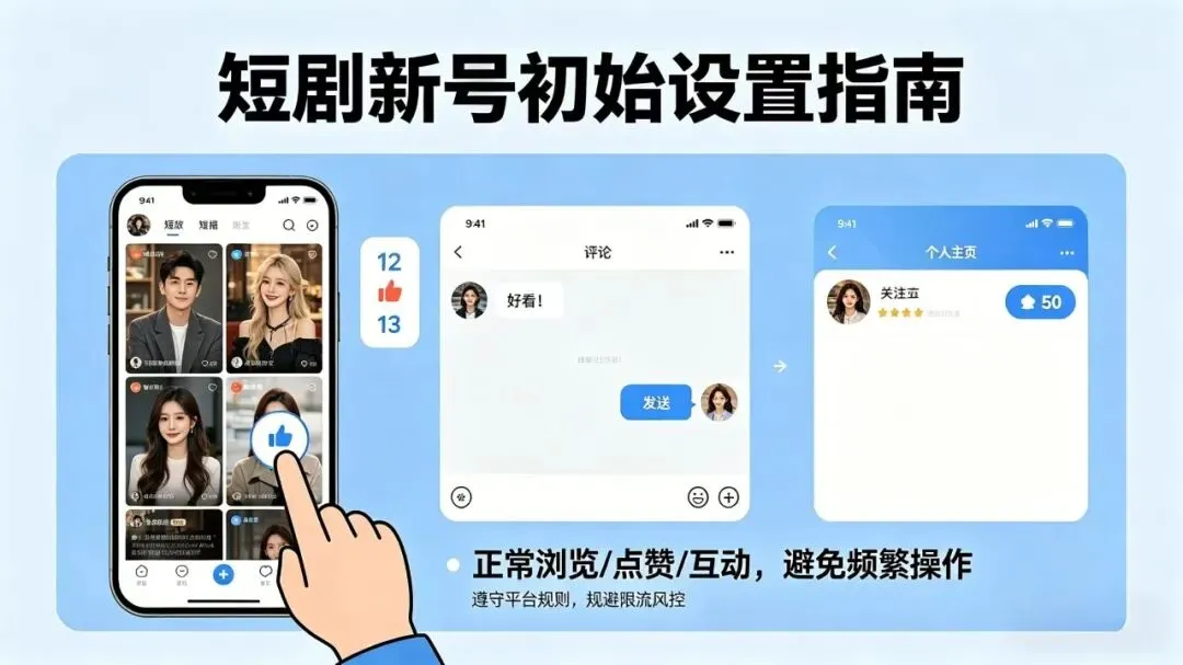 新号前期杜绝频繁改资料、批量删作品、频繁切换登录设备,保持账号正常浏览、点赞、互动,模拟真人使用行为,规避限流风控。