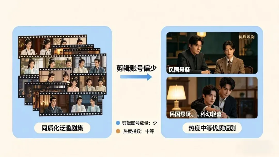 不要跟风做全网烂大街的爆款老剧,同类内容太多,新号没有竞争力,容易被平台压制流量。选择热度中等、剪辑账号偏少的优质短剧,竞争小,更容易跑出数据。