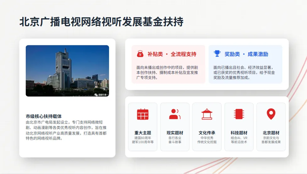 该基金是市级层面核心扶持载体,由北京市广电局发起设立,属于公益性、政策性基金,专门支持包括网络微短剧、动画漫剧在内的视听内容创作,扶持方式分为补贴和奖励两类,覆盖项目全周期。