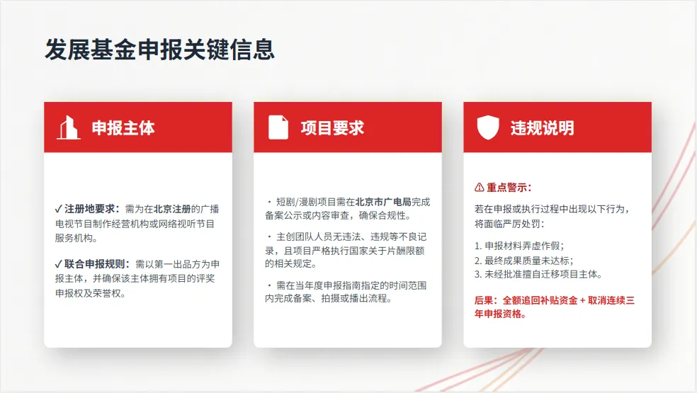 项目要求:短剧/漫剧需在北京市广电局完成备案公示或审查,主创人员无劣迹,符合片酬限额规定;不同类型项目需在对应时间范围内完成备案、拍摄或播出(具体以当年申报指南为准)。