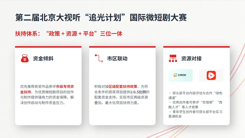 由北京市广电局主办,加码扶持优秀短剧项目,构建“政策+资源+平台”三位一体扶持体系,获奖项目可获得多重福利加持,助力项目落地与人才成长。