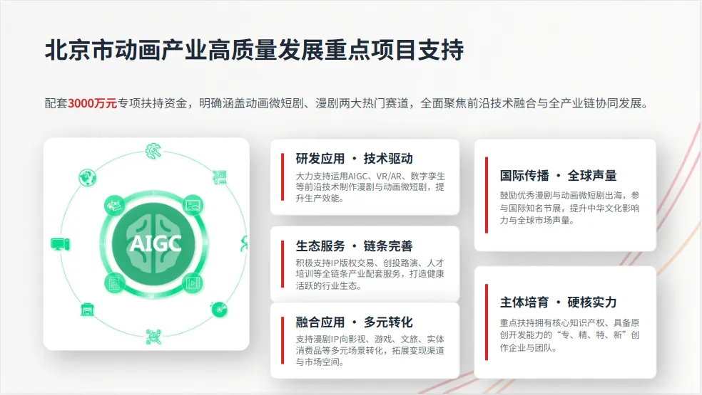 国际传播:支持漫剧/动画短剧出海,包括输出版权、参展国际节展,提升全球声量;支持落地北京的中外合作漫剧项目,打造国际化精品。