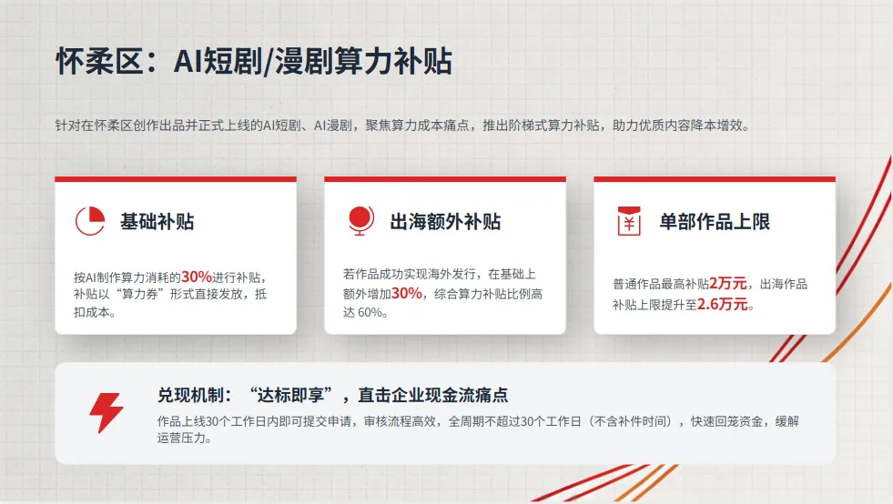 针对在怀柔区创作出品并正式上线的AI短剧、AI漫剧,聚焦算力成本痛点,推出阶梯式算力补贴,流程高效、兑现快速。